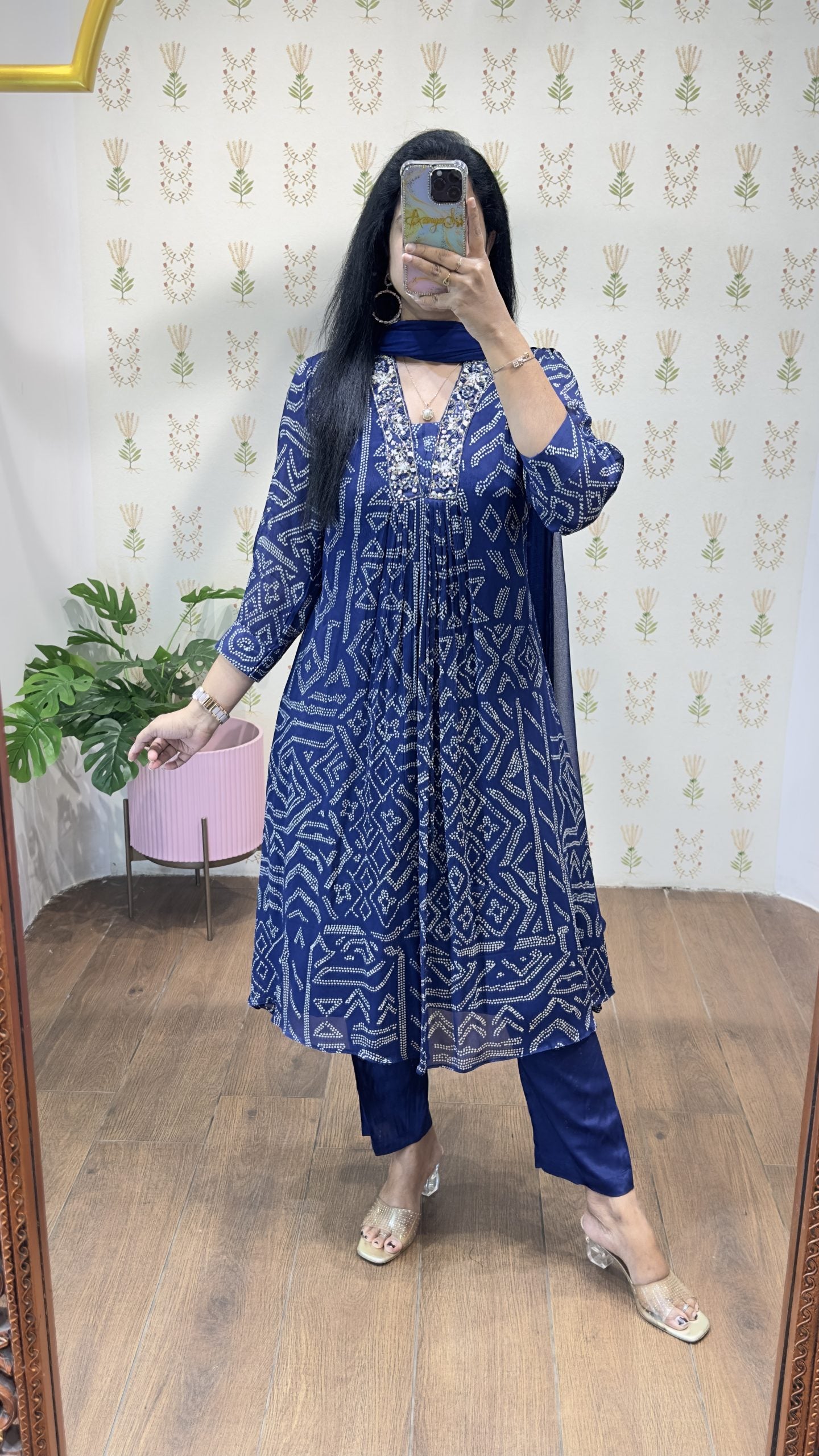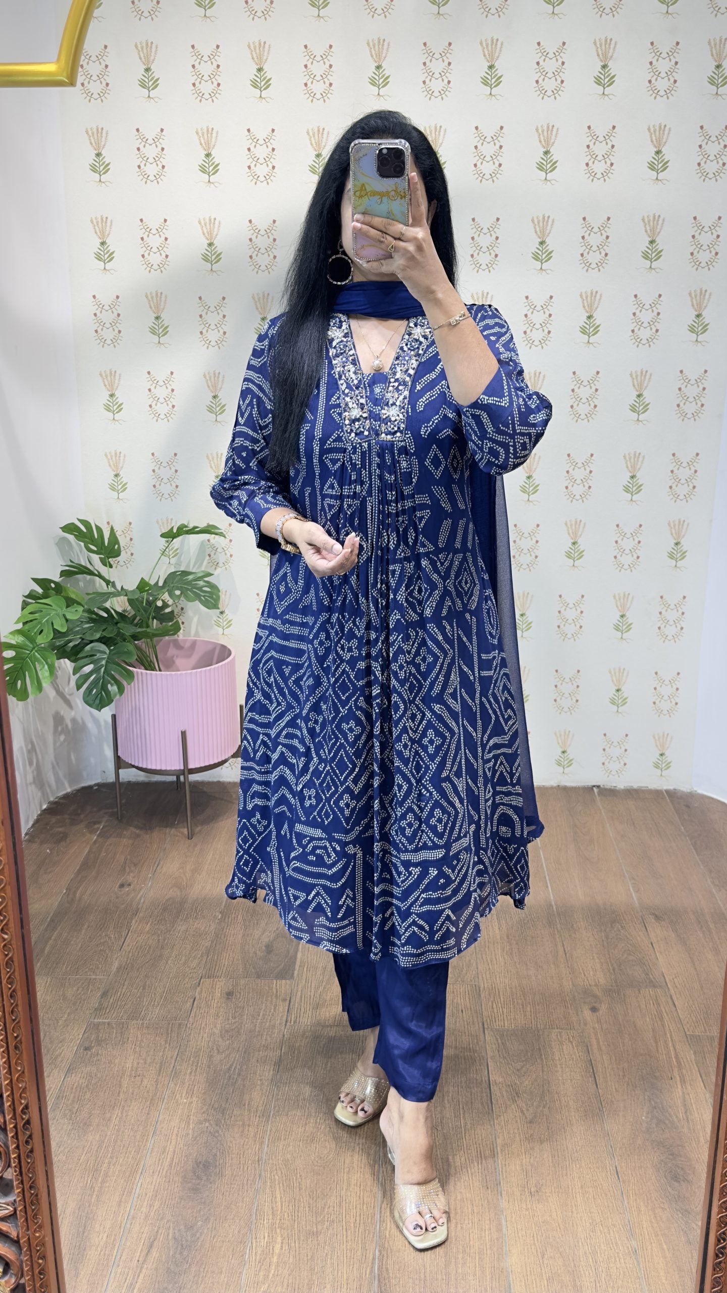 Blue Bandhini Chinnon Aline Suit Set Blue Bandhini Chinnon Aline Suit Set